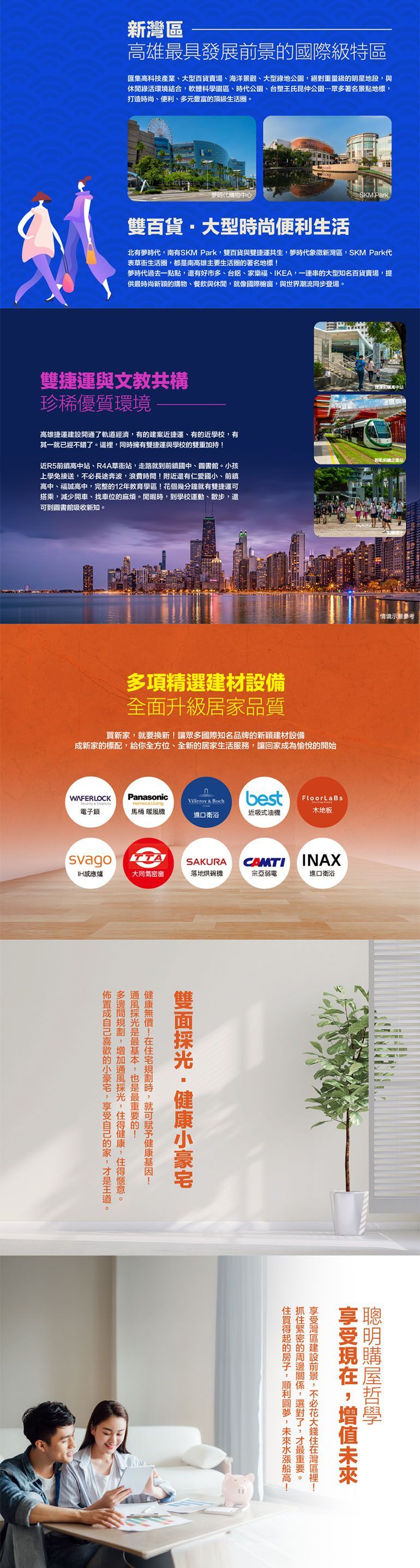 特色: #閃耀人生,入主新灣區光環生活圈 #新灣區―高雄最具發展前景的國際級特區 #匯集高科技產業•大型百貨賣場•海洋景觀•大型綠地公園,絕對重量級的明星地段,與休閒 綠活環境結合,軟體科雄園區、夢時代、時代公園、台塑王氏昆仲公園…眾多著名景點地標,打 造時尚•便利•多元豐富的頂級生活圈 #雙捷運與文教共構,珍稀優質環境近R5前鎮高中站•R4A草衙站,走路就到前鎮國中•圖書館 #雙百貨•北有夢時代,南有SKM Park,大型時尚便利生活 #陸海空三強―高雄國際機場•高雄港•國道1號,國際級鼎盛交通 #28%低公設比•高坪效規劃 #正2房•雙衛浴,年輕夫妻、單身貴族,首購宜居 #多邊間規劃,雙面採光,健康小豪宅 #多項精選建材設備,全面升級居家品質 #0店面•戶數單純,正2房~2+1房 #聰明購屋哲學,享受現在,增值未來